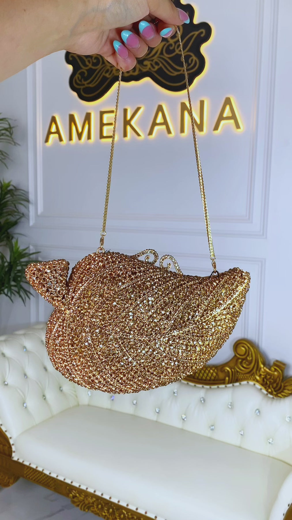 Crystal-encrusted clutch designed in a unique leaf-inspired silhouette