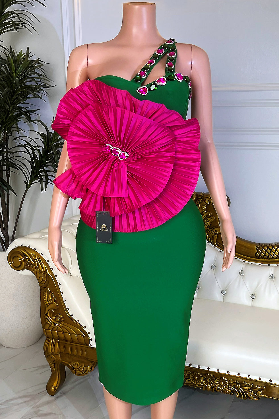 Dramatic oversized fuchsia pleated rosette detail across the bust for a bold couture statement