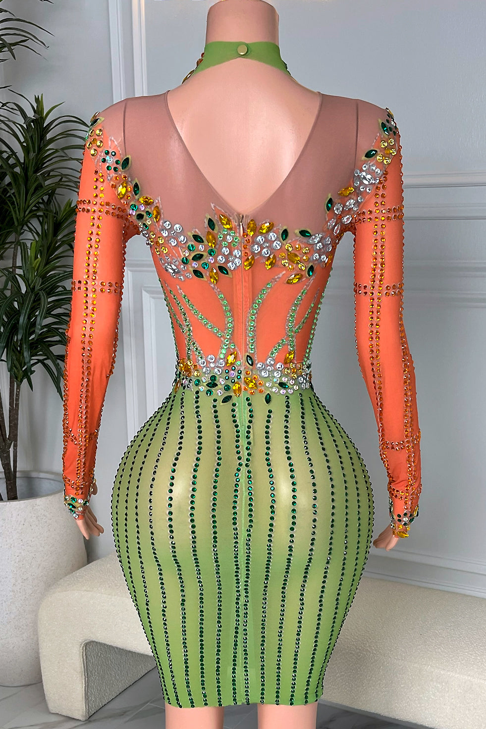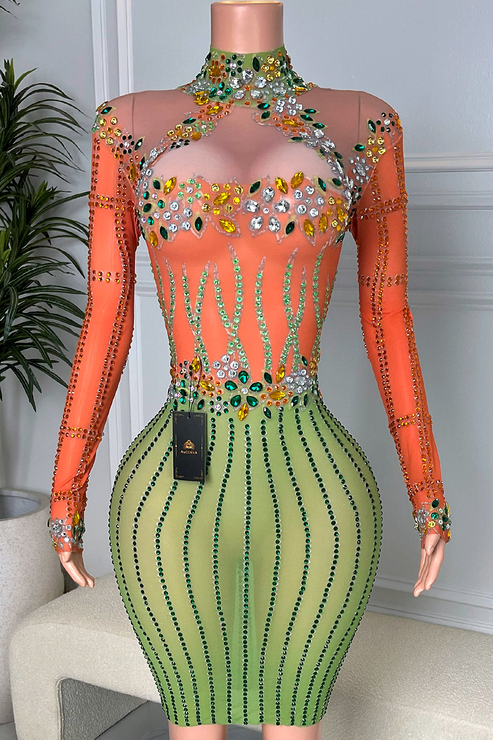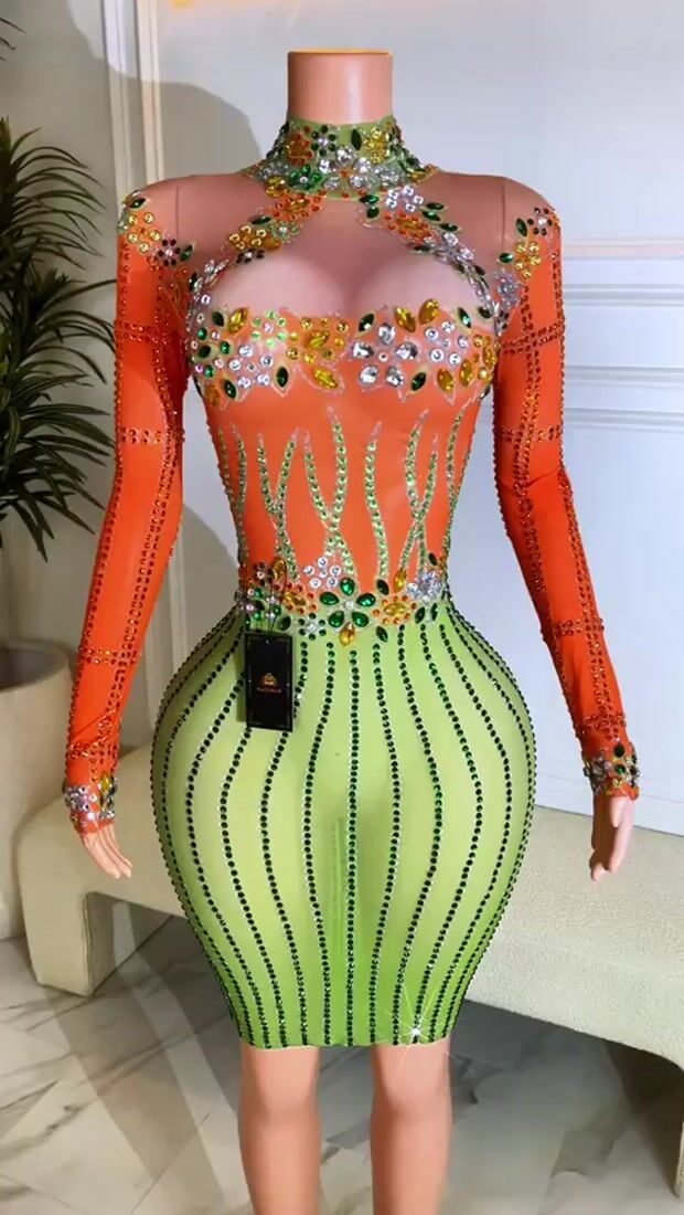 Feel exotic and classy in our Laylani Diamante Dress! It's the ultimate showstopper with a vibrant orange and green hue that sparkles with every move you make. Crafted from breathable mesh and brilliantly adorned with rhinestones, this sultry little number will never fail to impress on date night, cocktail hour, or any special occasion. Get ready to dance the night away in style!