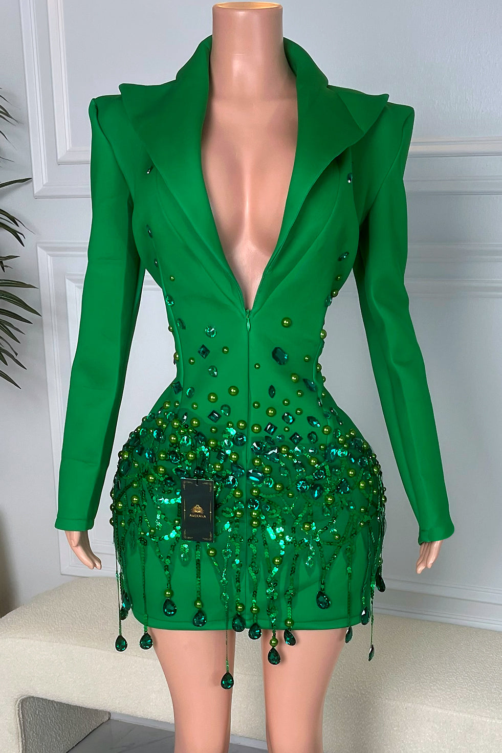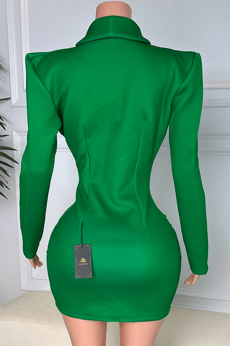 Style: Structured blazer-inspired mini dress with a deep V neckline