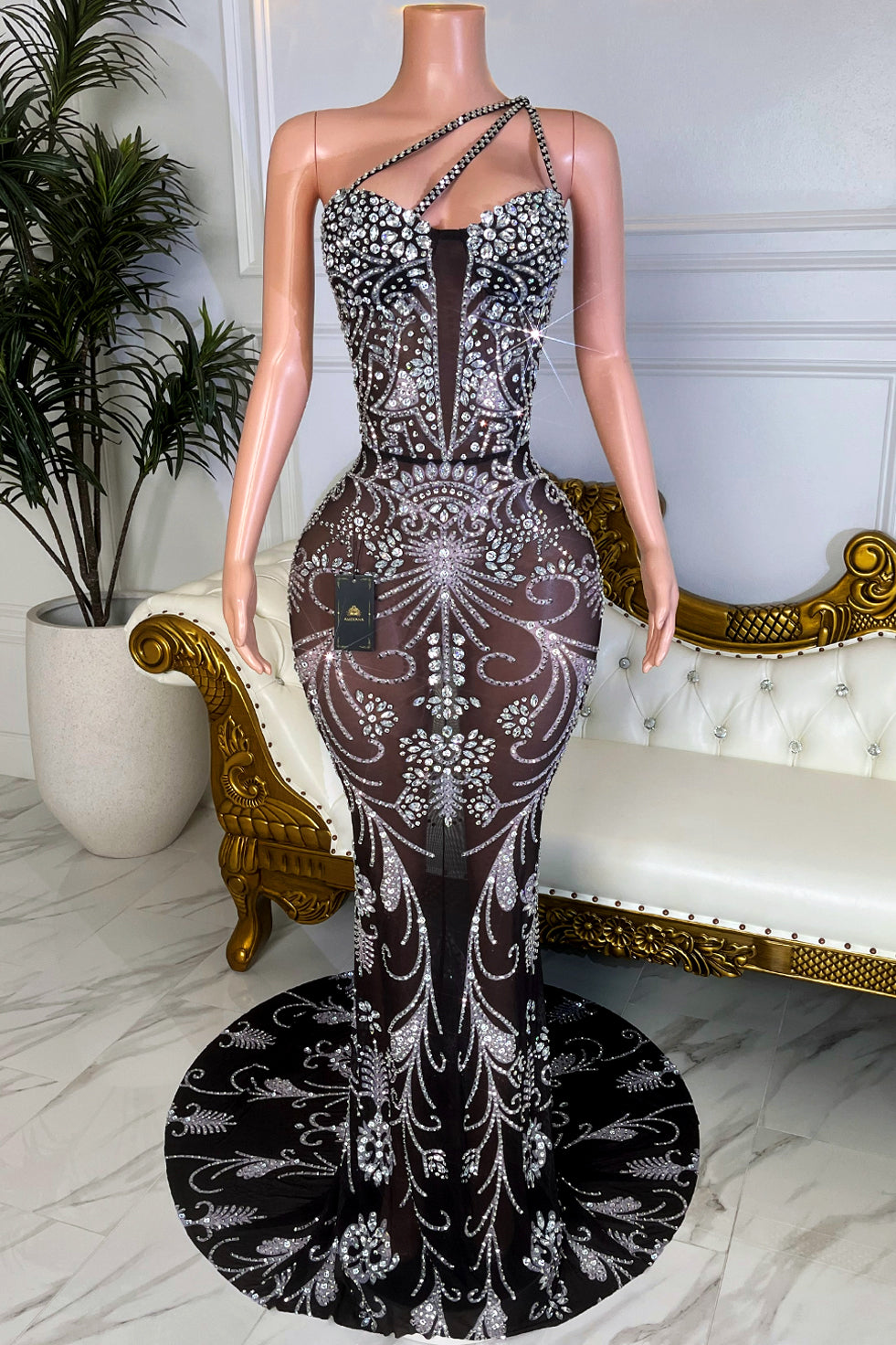 • Dazzling black sheer gown that merges sophistication with bold, red-carpet glamour.