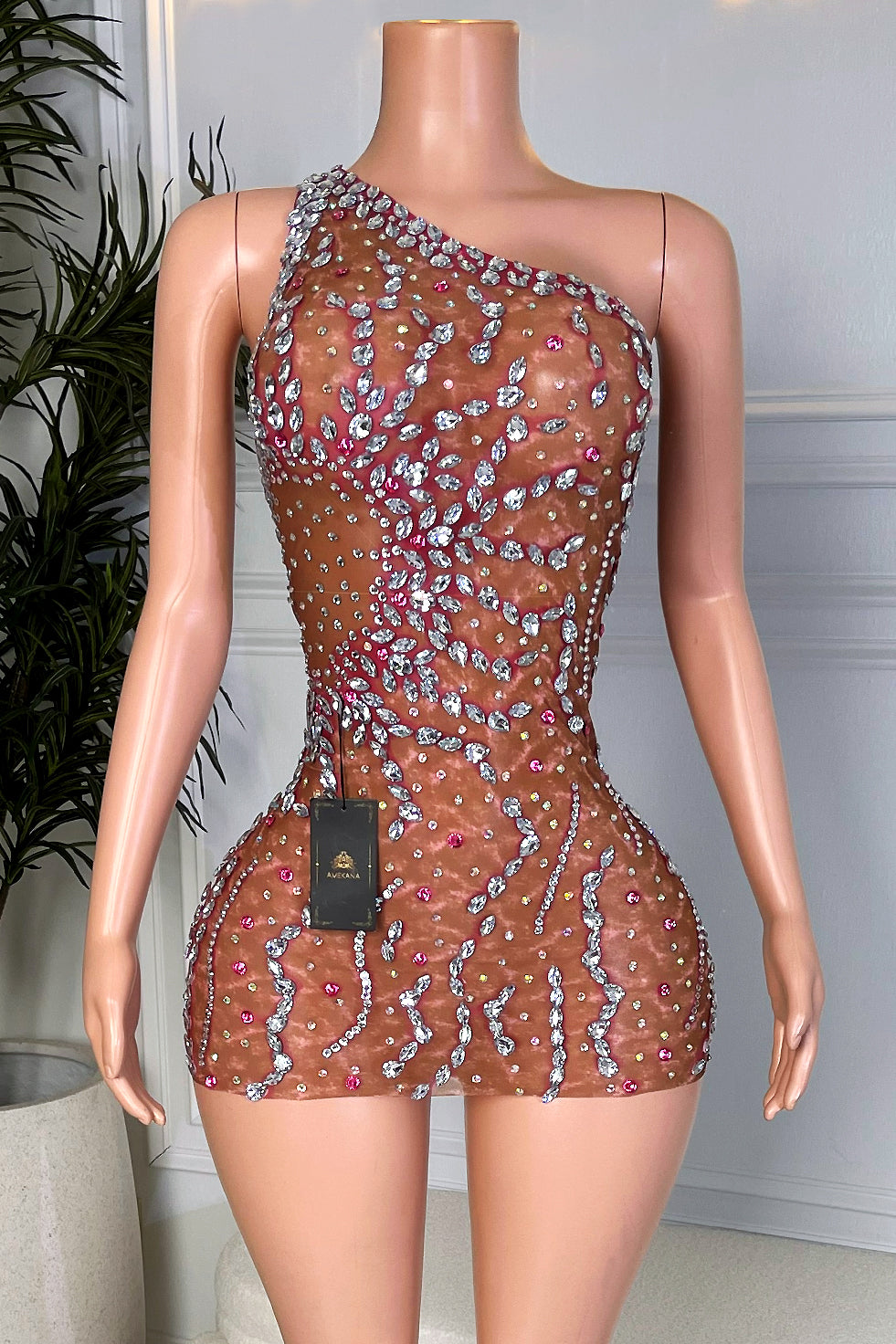 Nude illusion brown mesh one-shoulder mini dress with mixed rhinestone embellishments, featuring silver leaf-like crystals and pink stone accents