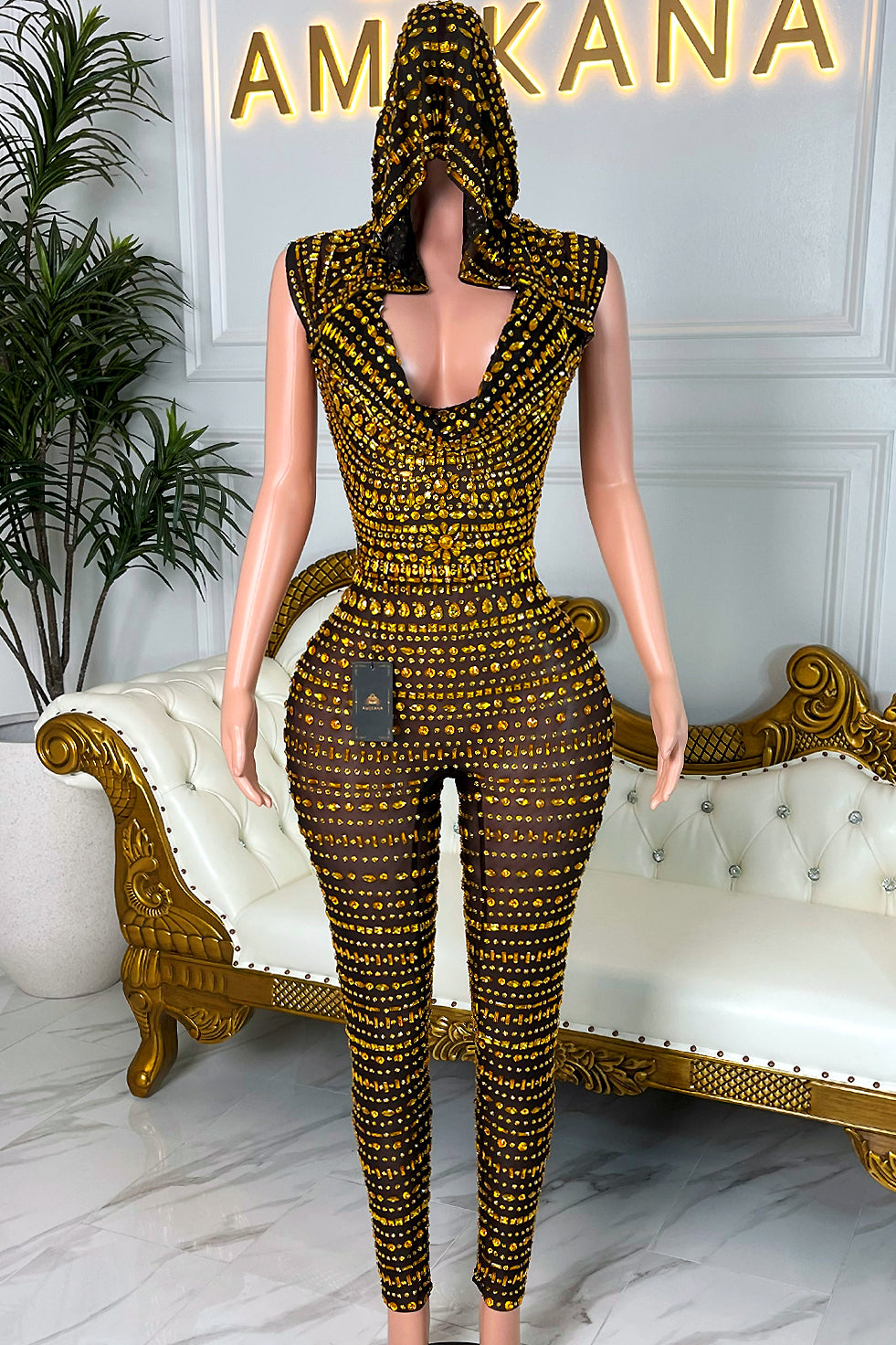 Black mesh base fully embellished with gold rhinestones in striped and grid patterns