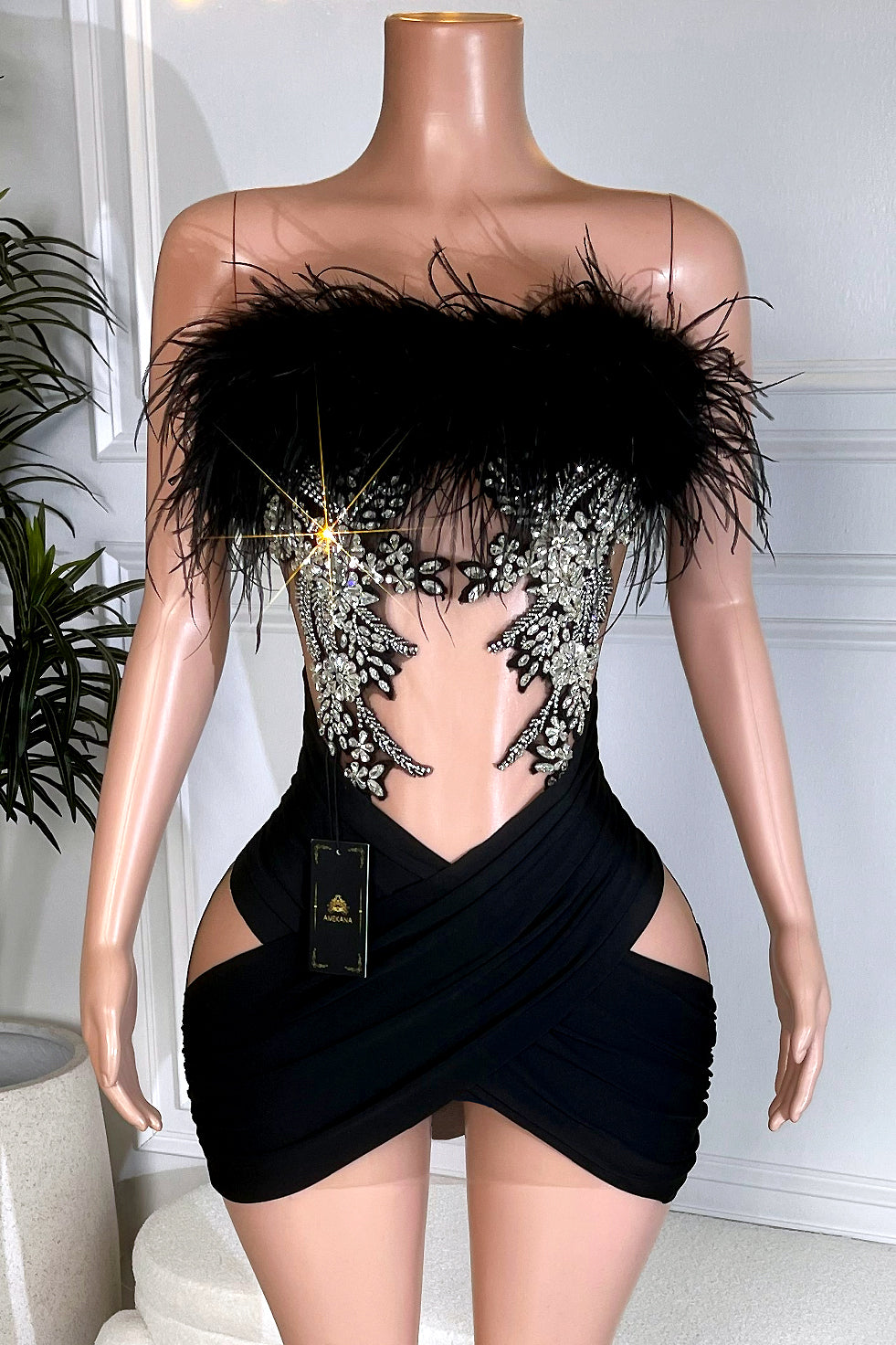 • Strapless mini with dramatic black feather bust detail for a glam statement.