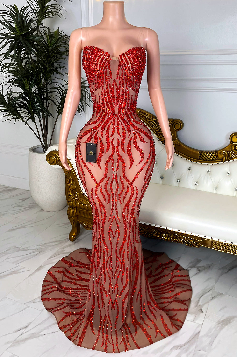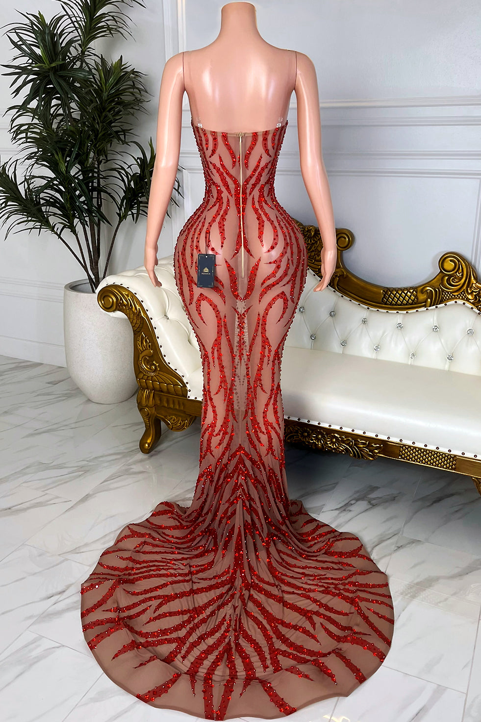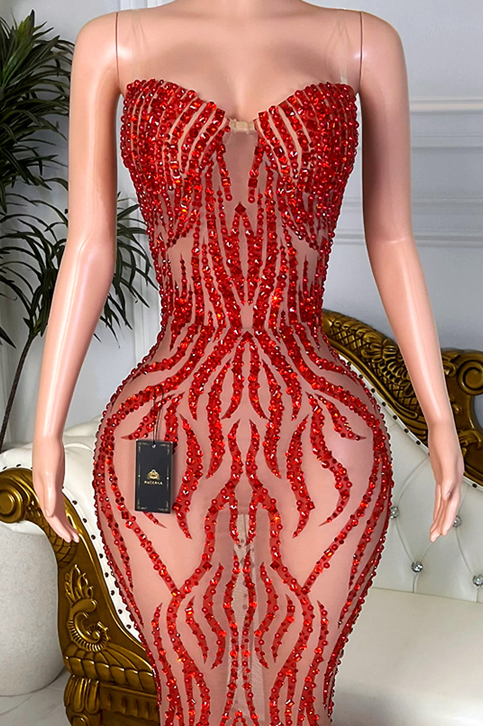 • Red hand-applied rhinestones placed in flame-like curves to define the waist and hips