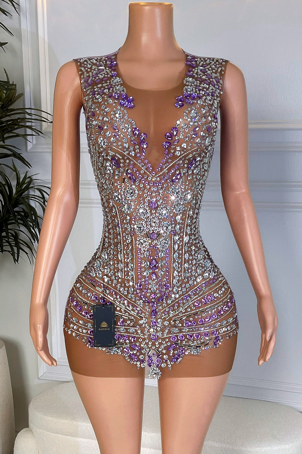 Sparkling purple rhinestone mini dress on a nude illusion mesh front, designed to sculpt and highlight your curves