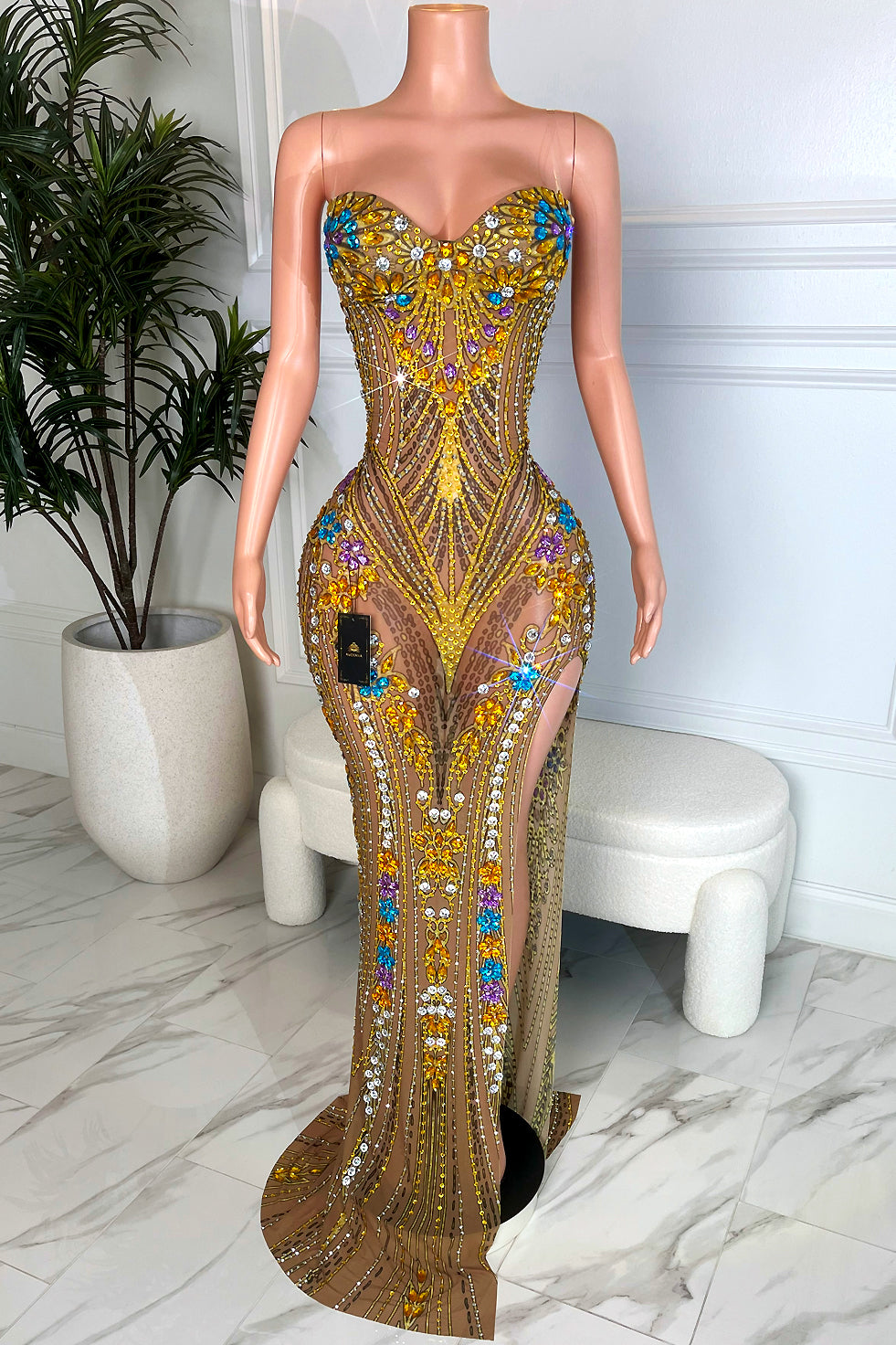 • Nude illusion maxi gown richly embellished with shimmering gold rhinestones and multi-colored crystal accents in blue, purple, and yellow