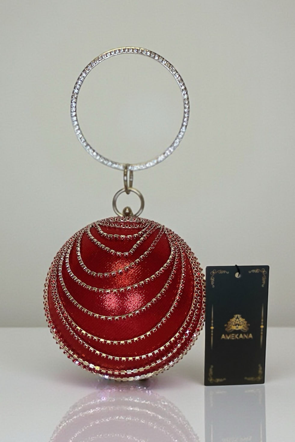 Statement red spherical clutch with a metallic shimmer finish for a bold, luxury look.