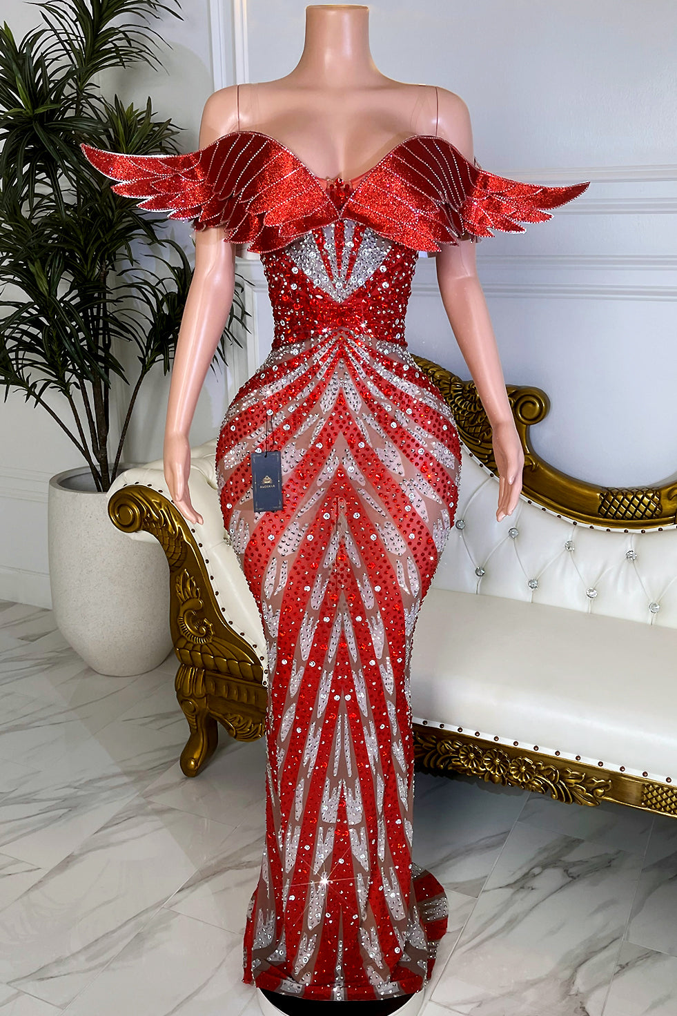 Luxurious red rhinestone gown with dramatic winged off shoulder neckline and sculpted bustier bodice