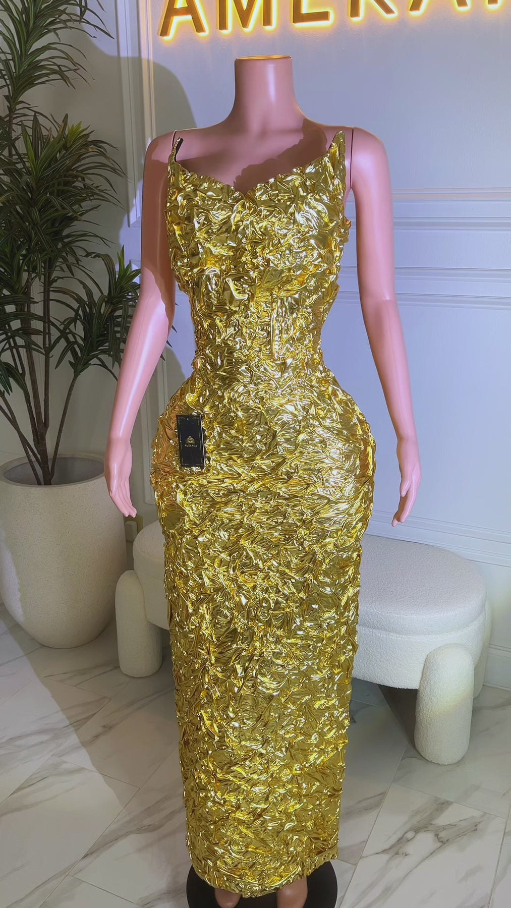 • Luxurious gold metallic maxi dress with a sculpted silhouette