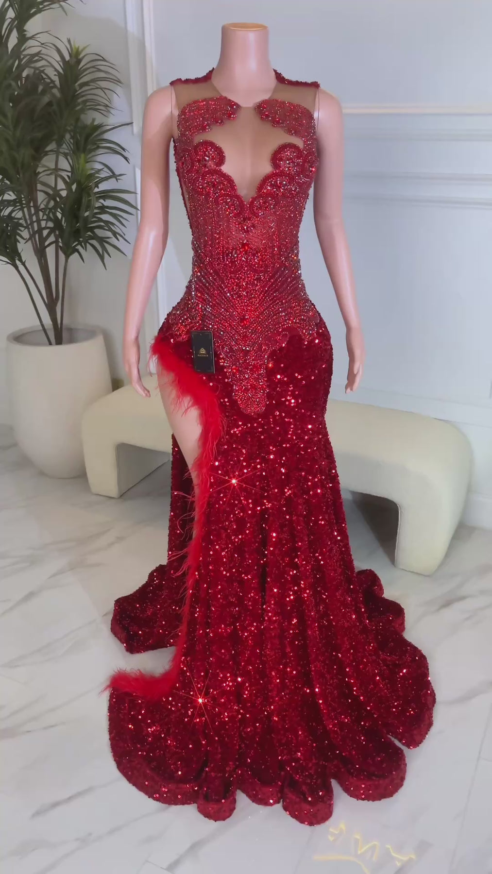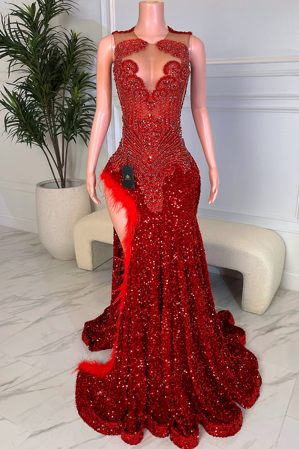 Details: High slit with feather trim on the left thigh for dramatic flair