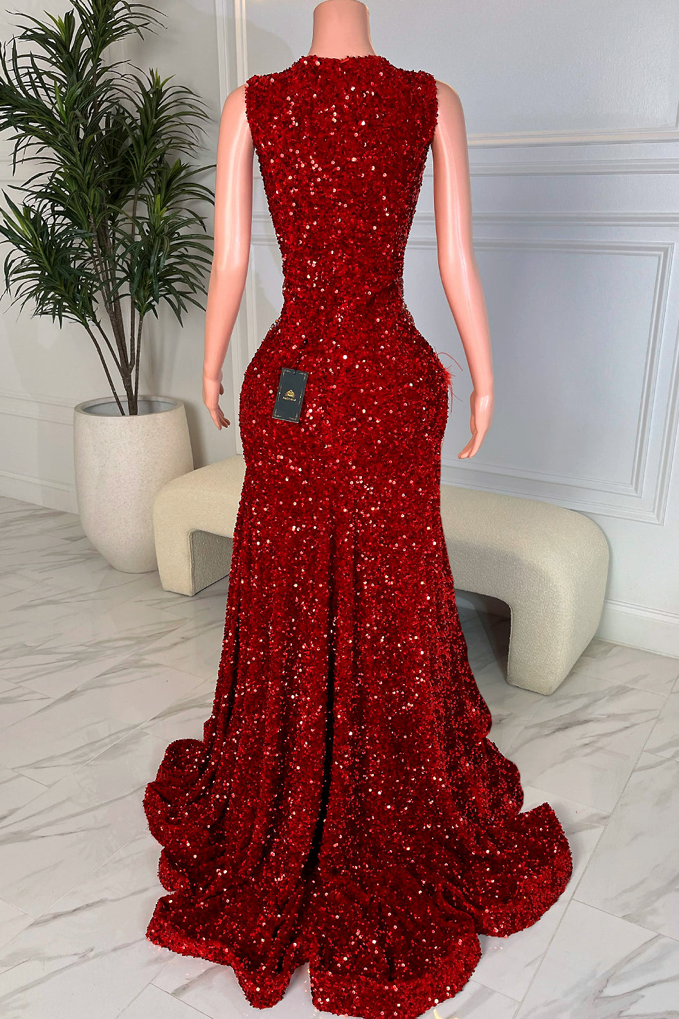 Color: Striking red with shimmering sequins throughout