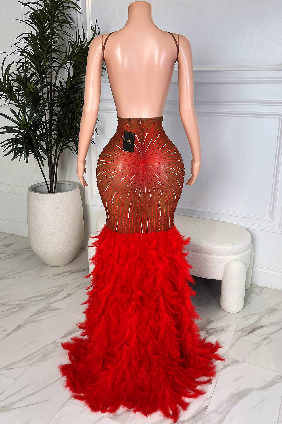 Full-length silhouette with a bold feather mermaid hem that brings volume, drama, and movement