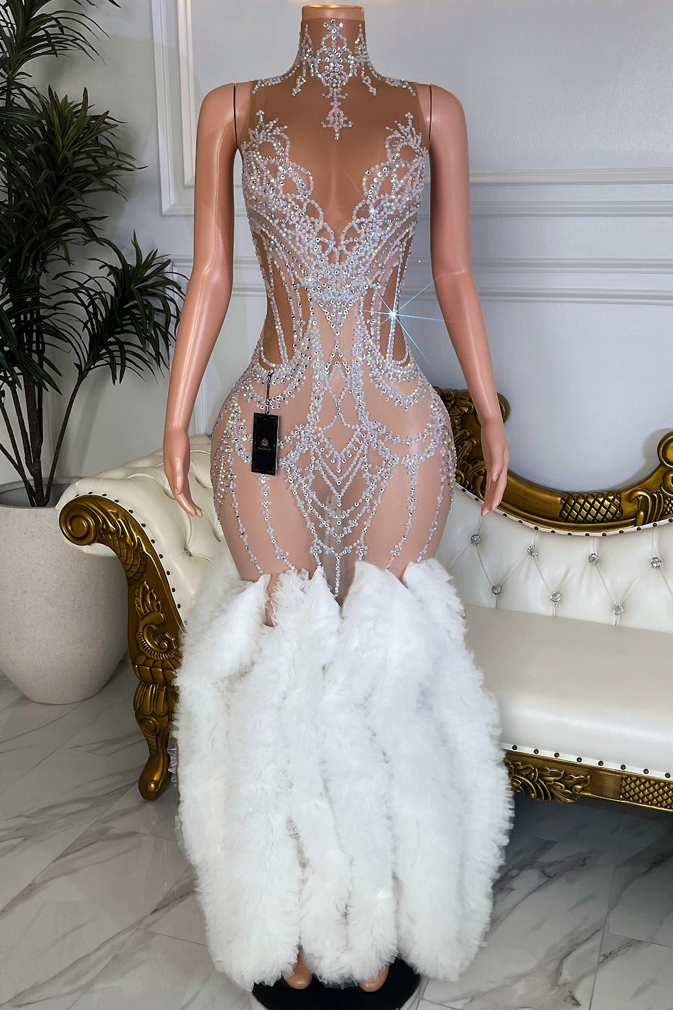 Dramatic fluffy white feather skirt starting at the knees for a luxe mermaid finish