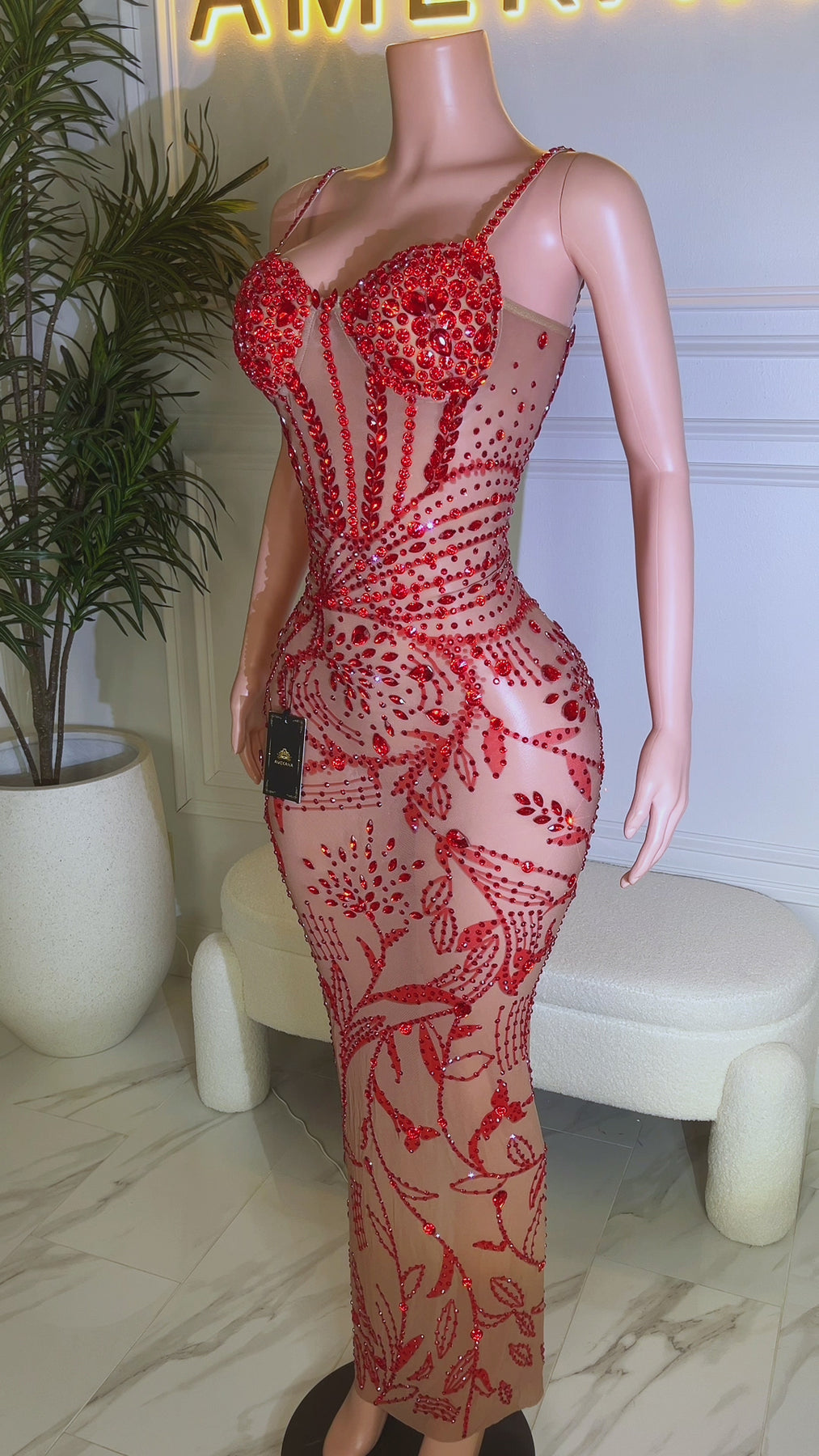 Amekana Scarlet Bloom Goddess Dress, red rhinestone floral nude illusion midi dress, front view on mannequin.