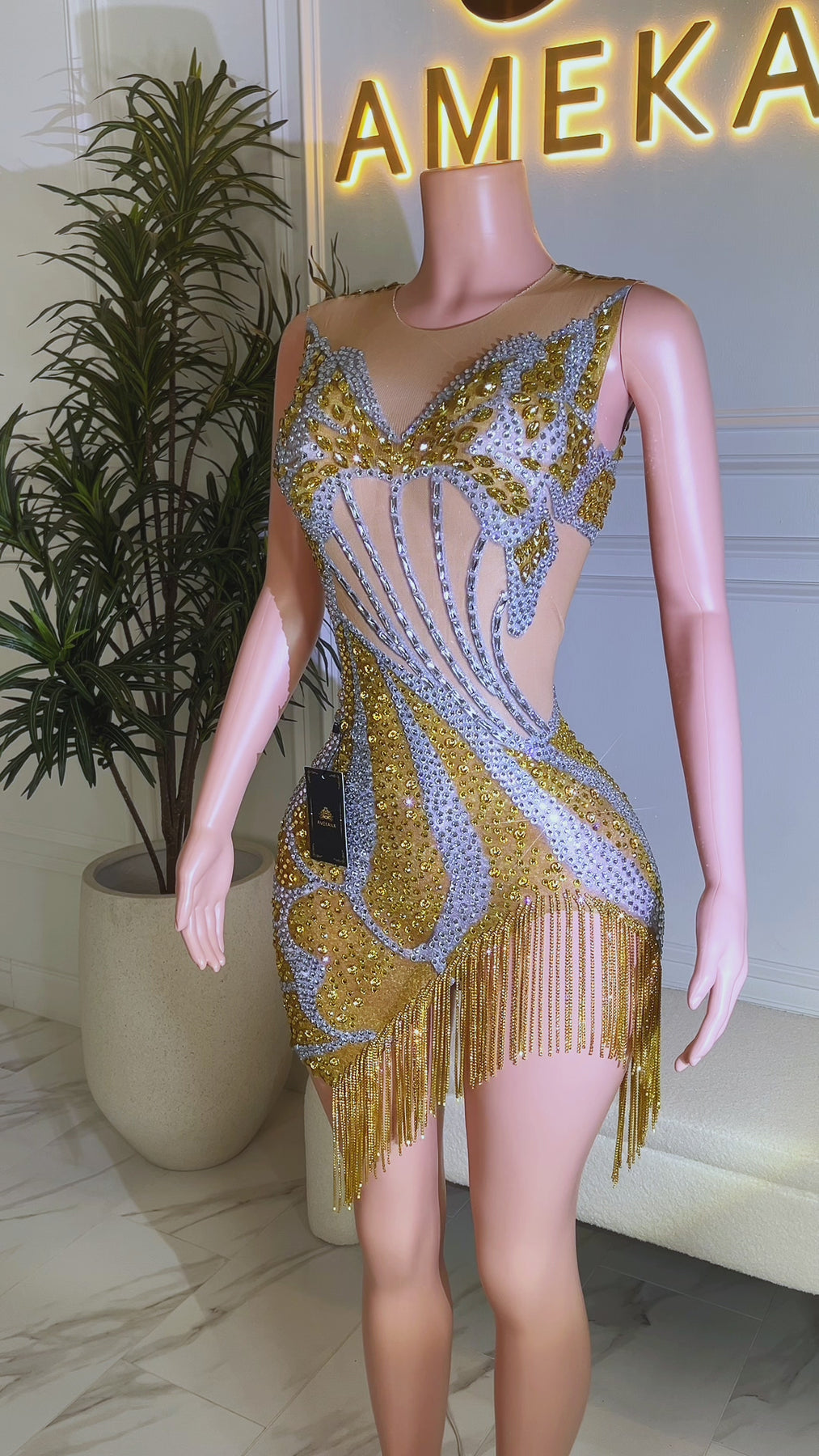 Back view of gold and silver rhinestone butterfly mini dress with nude illusion mesh and tassel fringe hem by Amekana