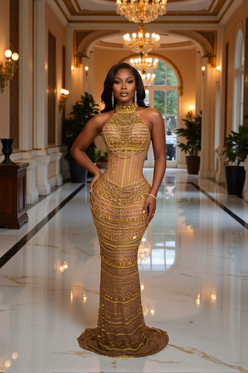 Golden rhinestone-embellished mesh gown designed to accentuate every curve with a regal, statuesque silhouette.