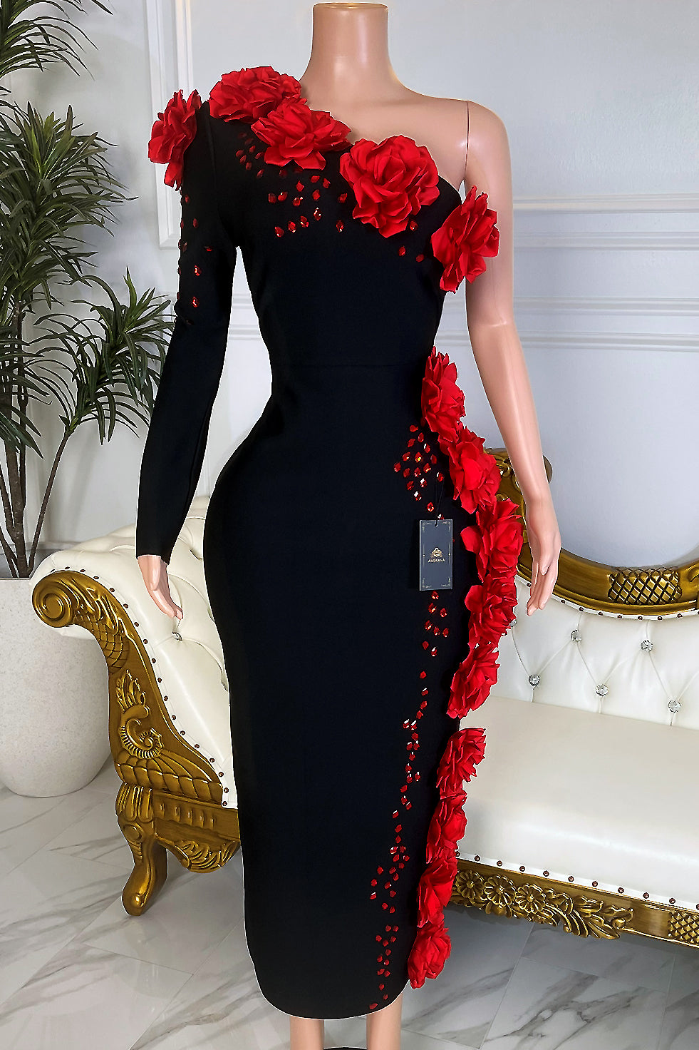 Black one shoulder bandage midi dress with sleek, sculpting fit