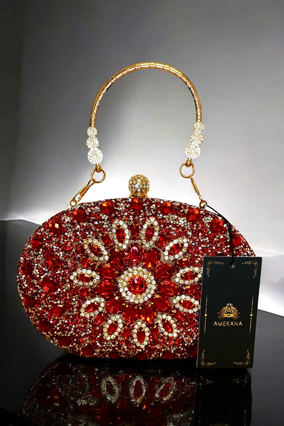 • Oval-shaped evening clutch covered in brilliant red crystals and shimmering silver accents