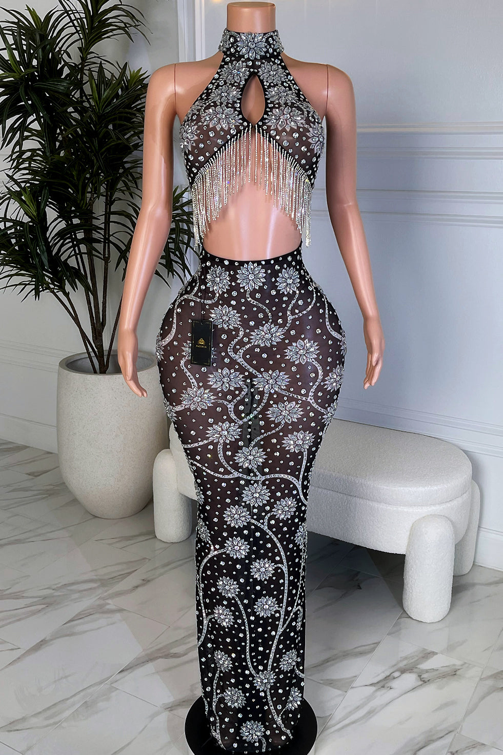 • Off-shoulder black sheer maxi gown with crystal-embellished neckline and intricate diamond-pattern rhinestone detailing throughout