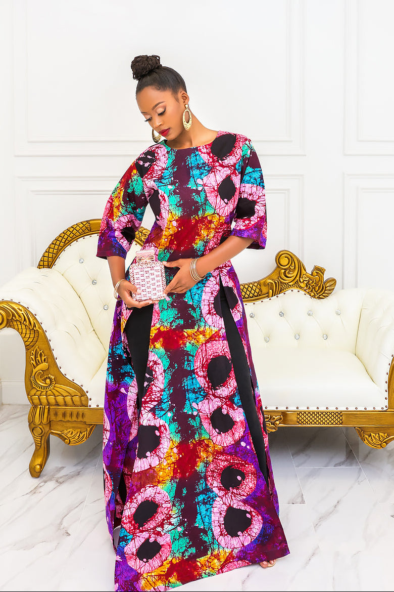 • Ankara piece in a bold multicolor circular print (red, pink, teal, purple, and black)