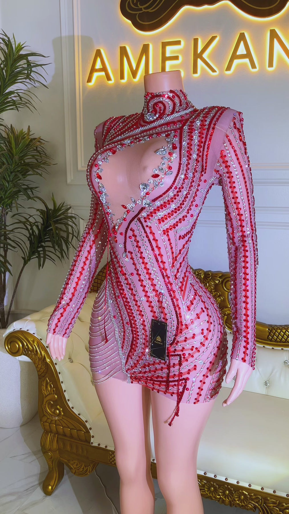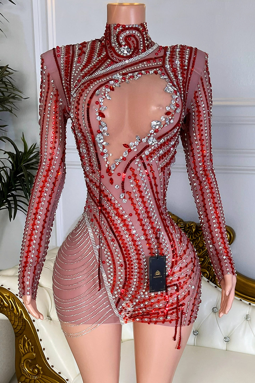 Nude illusion mini dress with bold red and silver rhinestone swirls