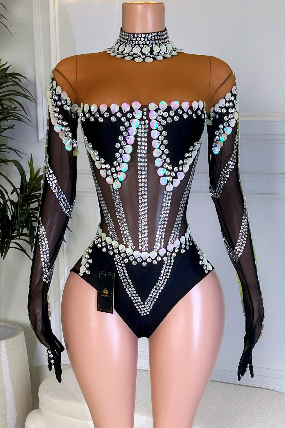 • Black sheer illusion bodysuit adorned with large iridescent crystal appliqués and sequin embellishments
