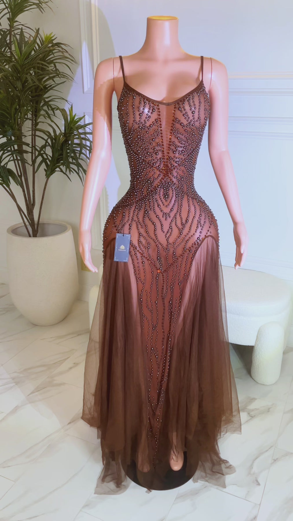 • Rich chocolate-brown maxi gown with a nude mesh illusion base for a sultry, sculpted effect