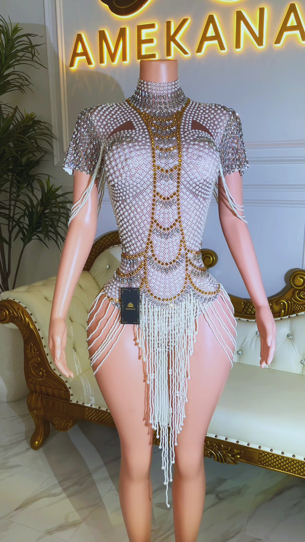 This romper is a veritable party on your body! Strut your stuff in the Hera Pearl Diamante Tassel Bodysuit, fit for any occasion from clubbing to birthdays. Made with Spandex, this bodysuit glitters with pearls, rhinestones, and its fabulously fringed tassels. Get the look that will have everyone talking!