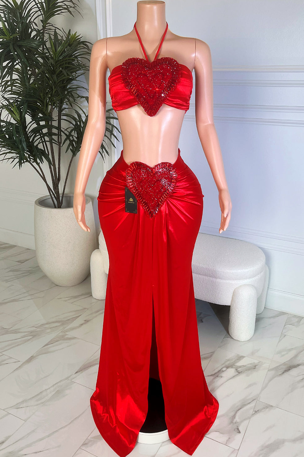 • Striking two-piece set in bold red satin with a sultry halter-style crop top