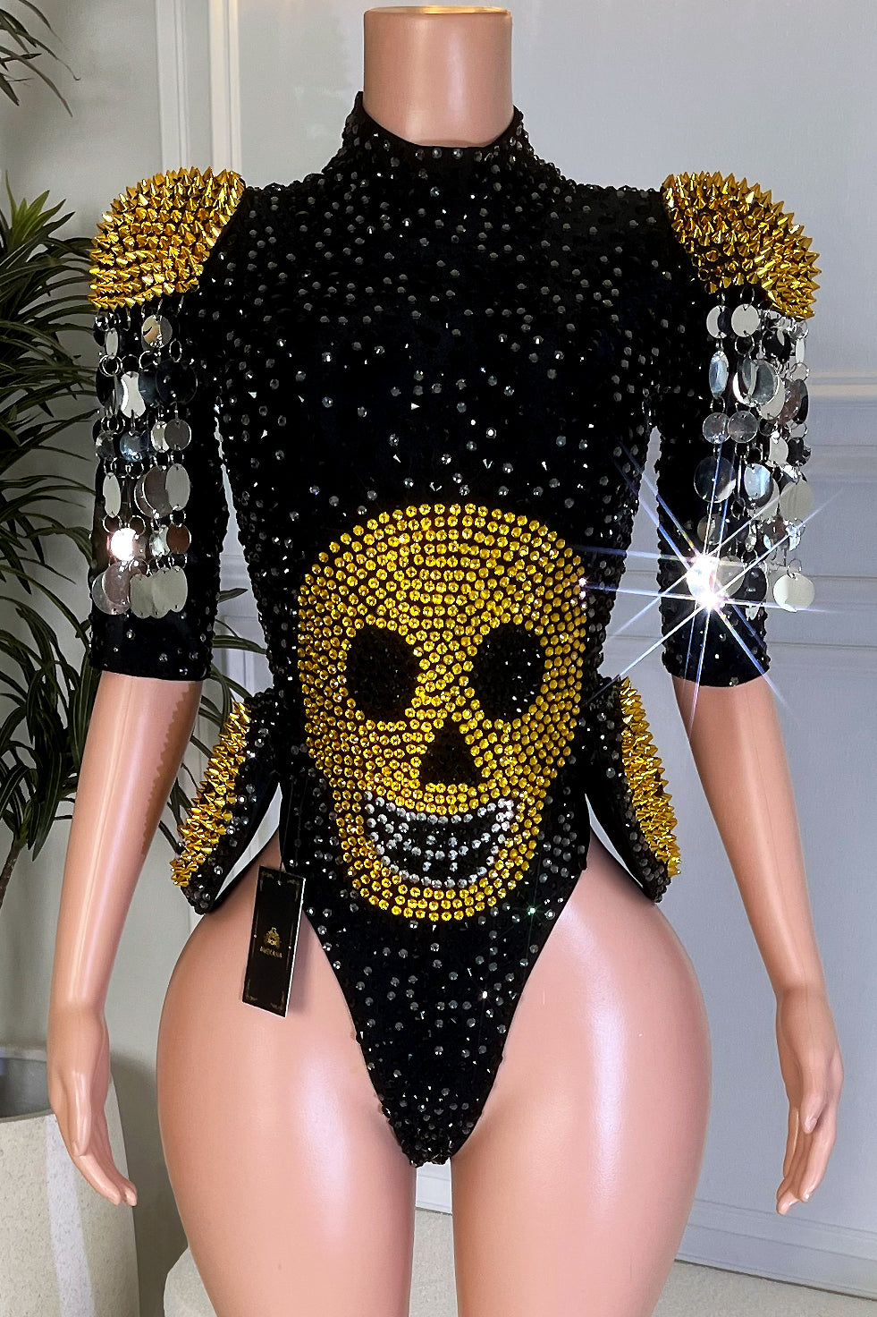 • Fierce black rhinestone-embellished bodysuit featuring a bold gold skull crystal design at the front