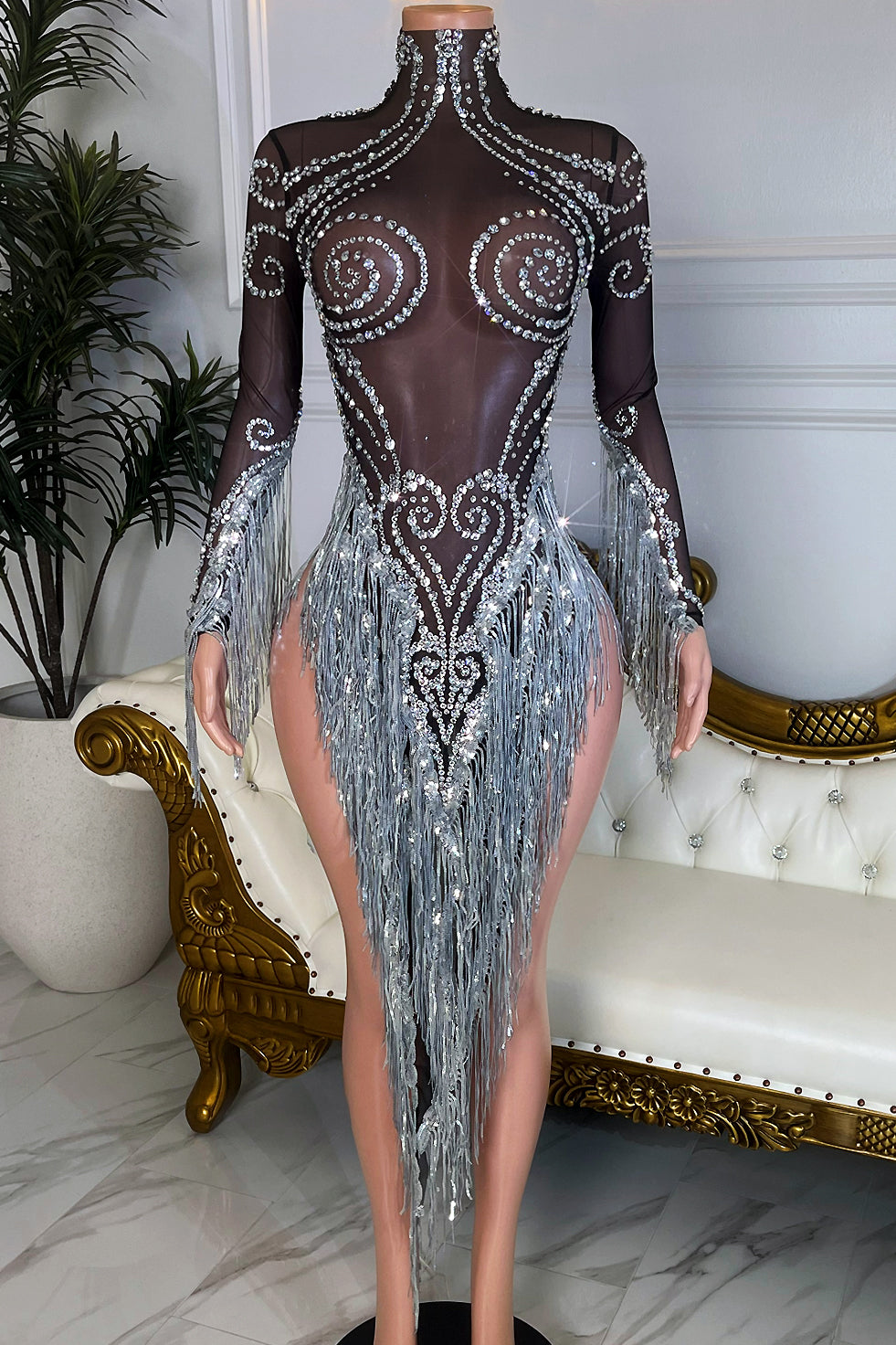 • Dramatic silver fringe dripping from the hips and sleeves for maximum movement