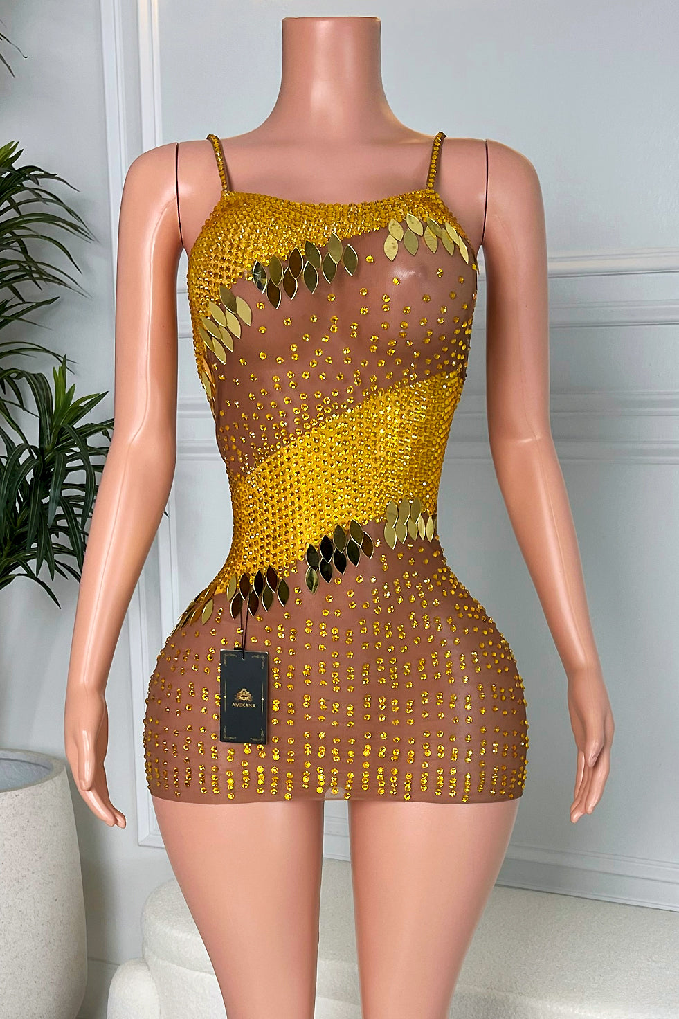 • Embellished with golden rhinestones in a geometric scattered pattern