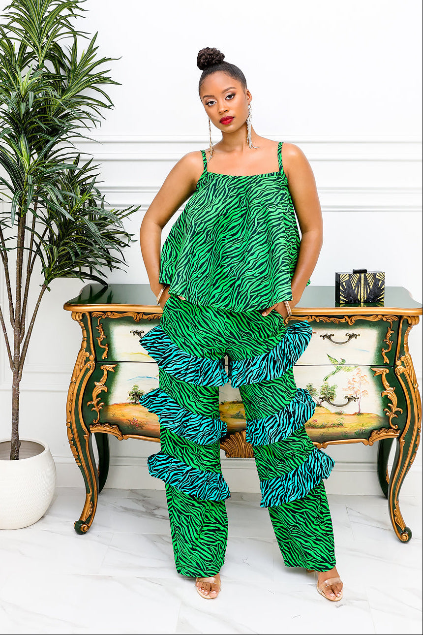 Step into fierce fashion with this bold green zebra-print Ankara pant set. Designed with statement-making layered ruffles along the pants, this set brings drama and movement to every step. The sleeveless cami-style top with thin straps gives it a breezy, flattering fit, while the must-have side pockets add both style and function. Perfect for standing out at parties, festivals, or casual glam outings, this set delivers confidence, comfort, and undeniable queen energy.