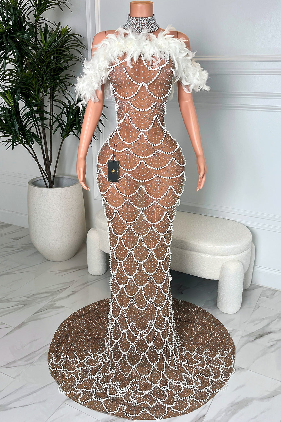 • Nude illusion maxi gown lavishly adorned with cascading white pearl beading in scalloped patterns