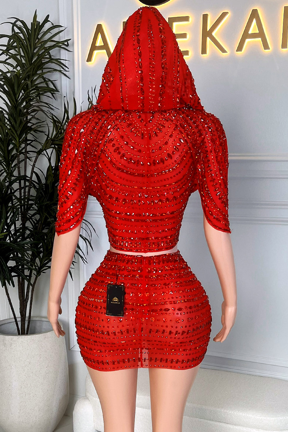 Two piece hooded set, rhinestone mesh crop top and matching mini skirt
