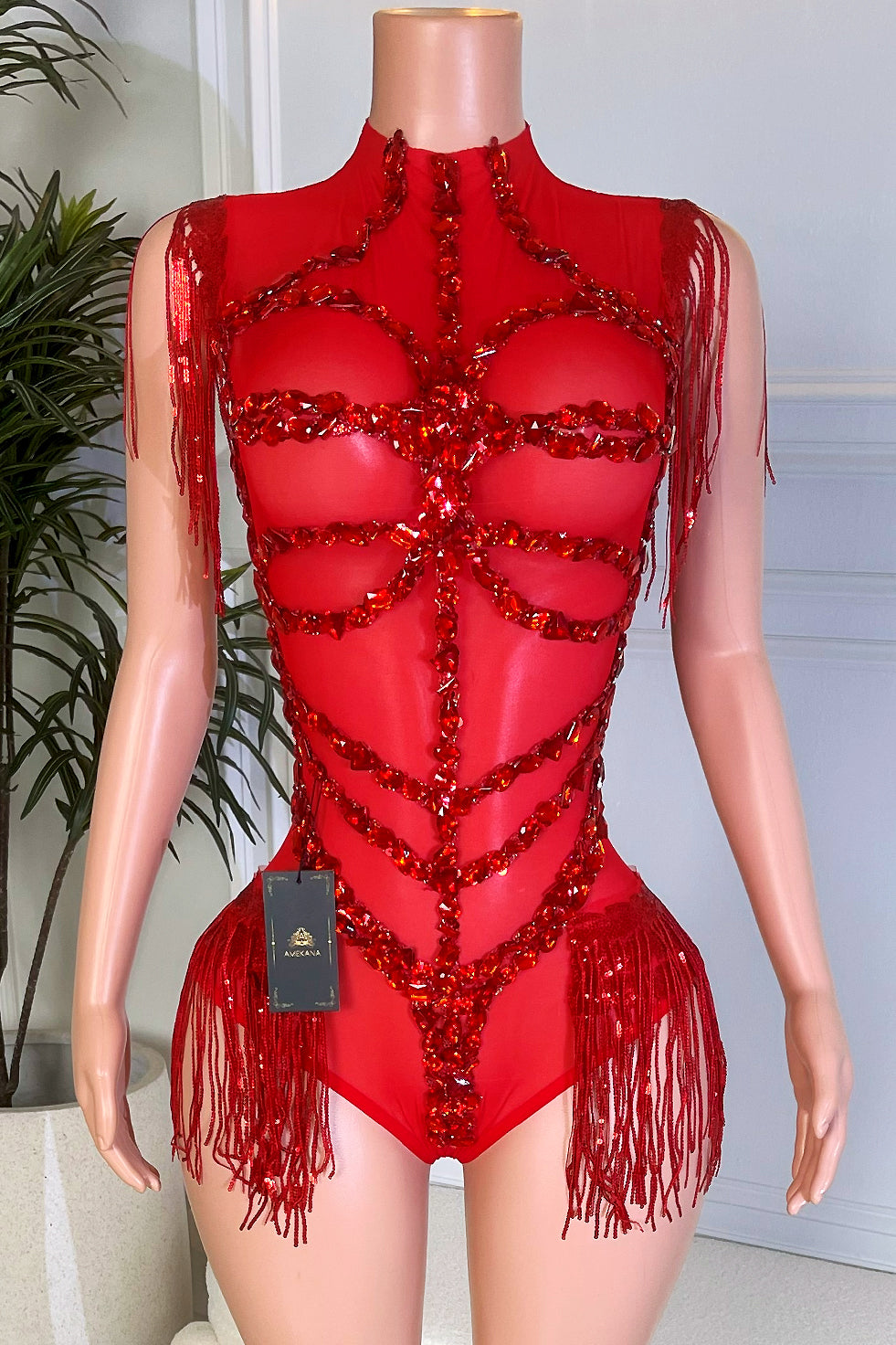 Bold sheer red base with sculpted rhinestone embellishments
