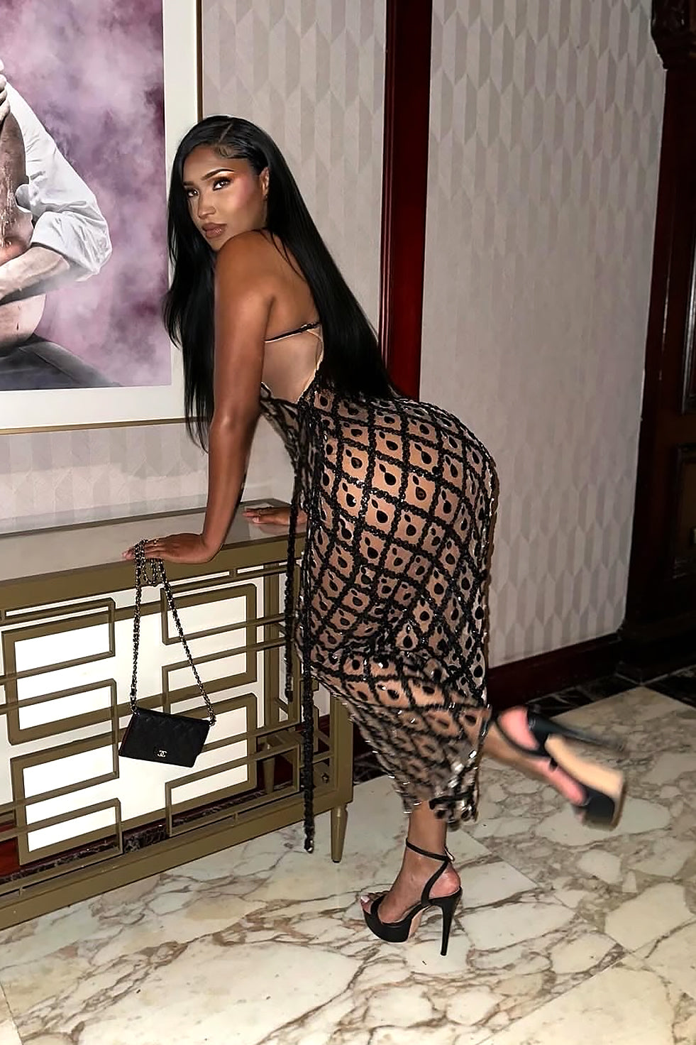 • Intricate hand-beaded black crystal lattice over sheer nude mesh