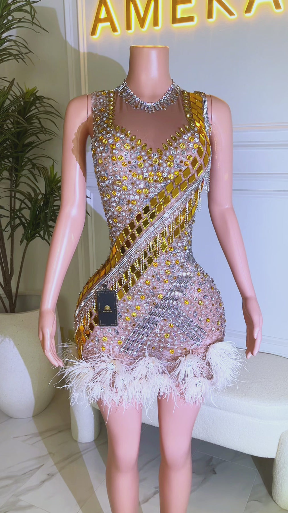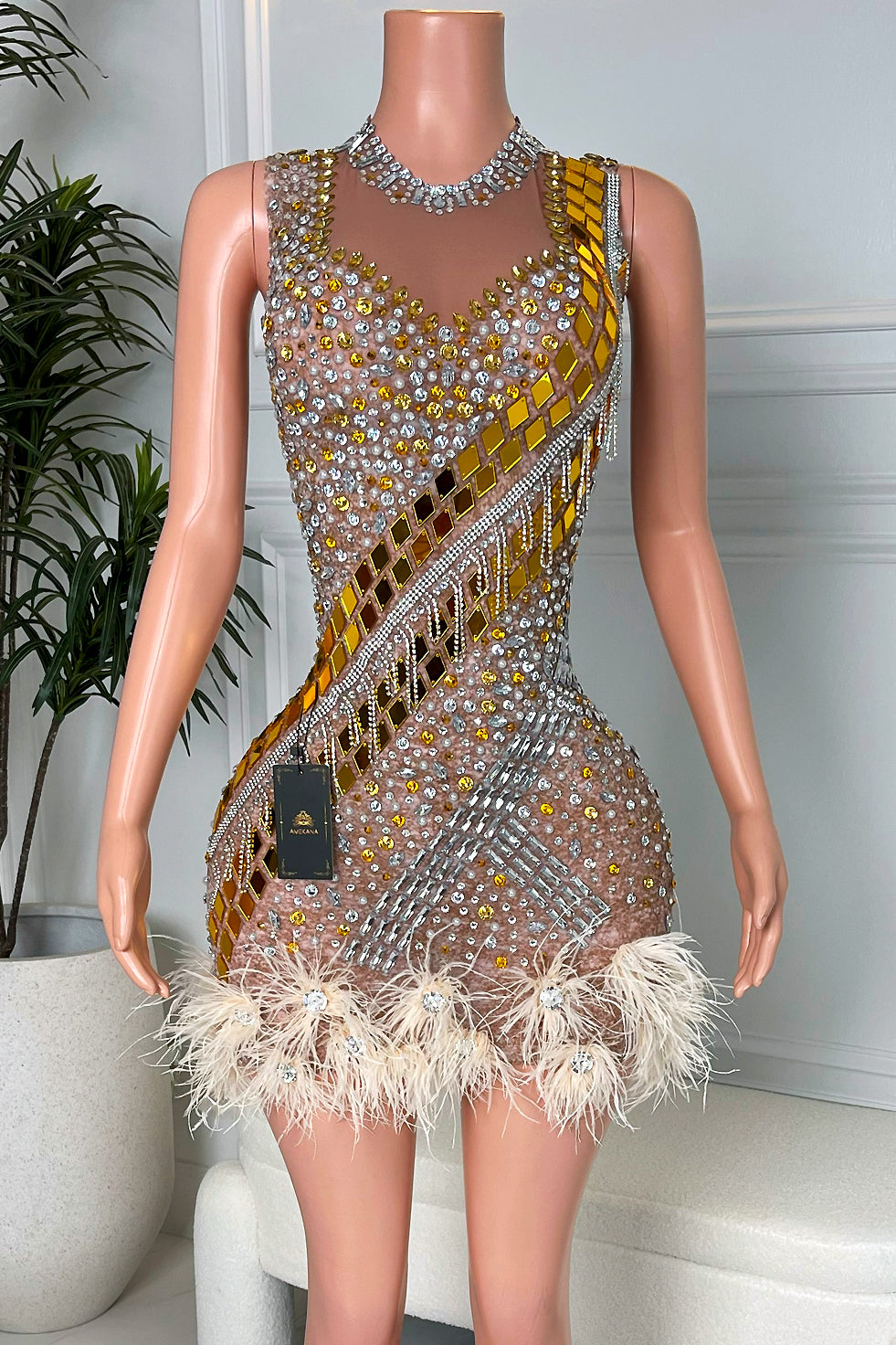 • A statement mini dress blending sparkle, mirror shine, and feather luxury