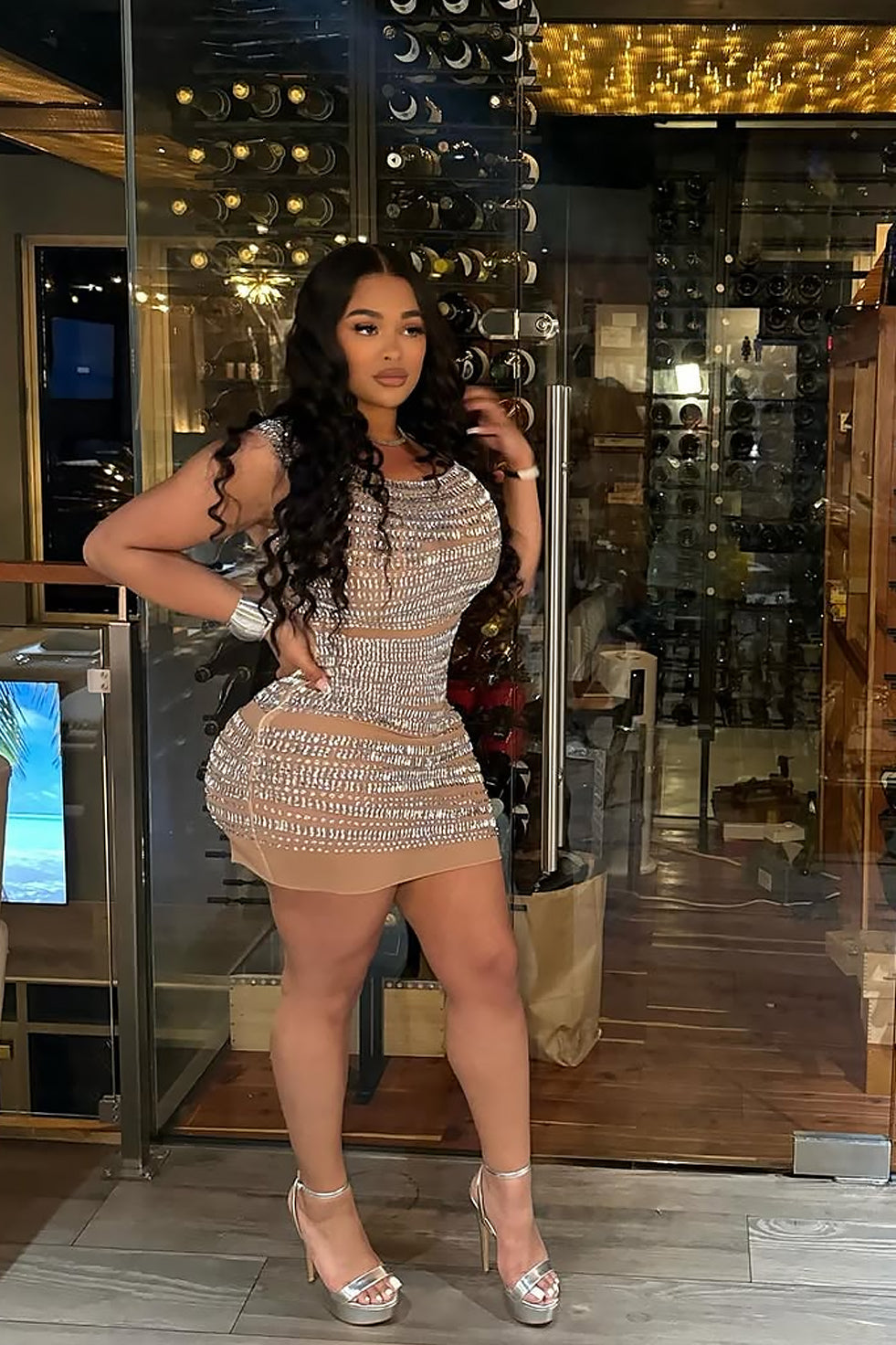 This Cello Diamante Dress is a must-have for any special occasion. Made with stretchy mesh material and featuring an off-shoulder design, this silver mini dress will make you feel sexy and alluring. The silver rhinestones in a circular pattern add the perfect touch of glamour. Perfect for date nights, birthday dinners, and girls night out.