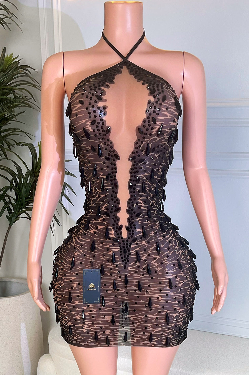 • Black mini dress with sheer nude illusion base
