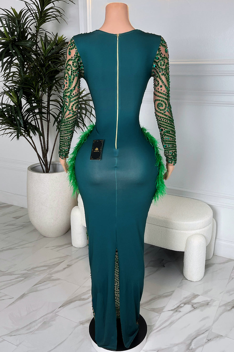 Covered in emerald green rhinestones arranged in ornate, regal patterns.