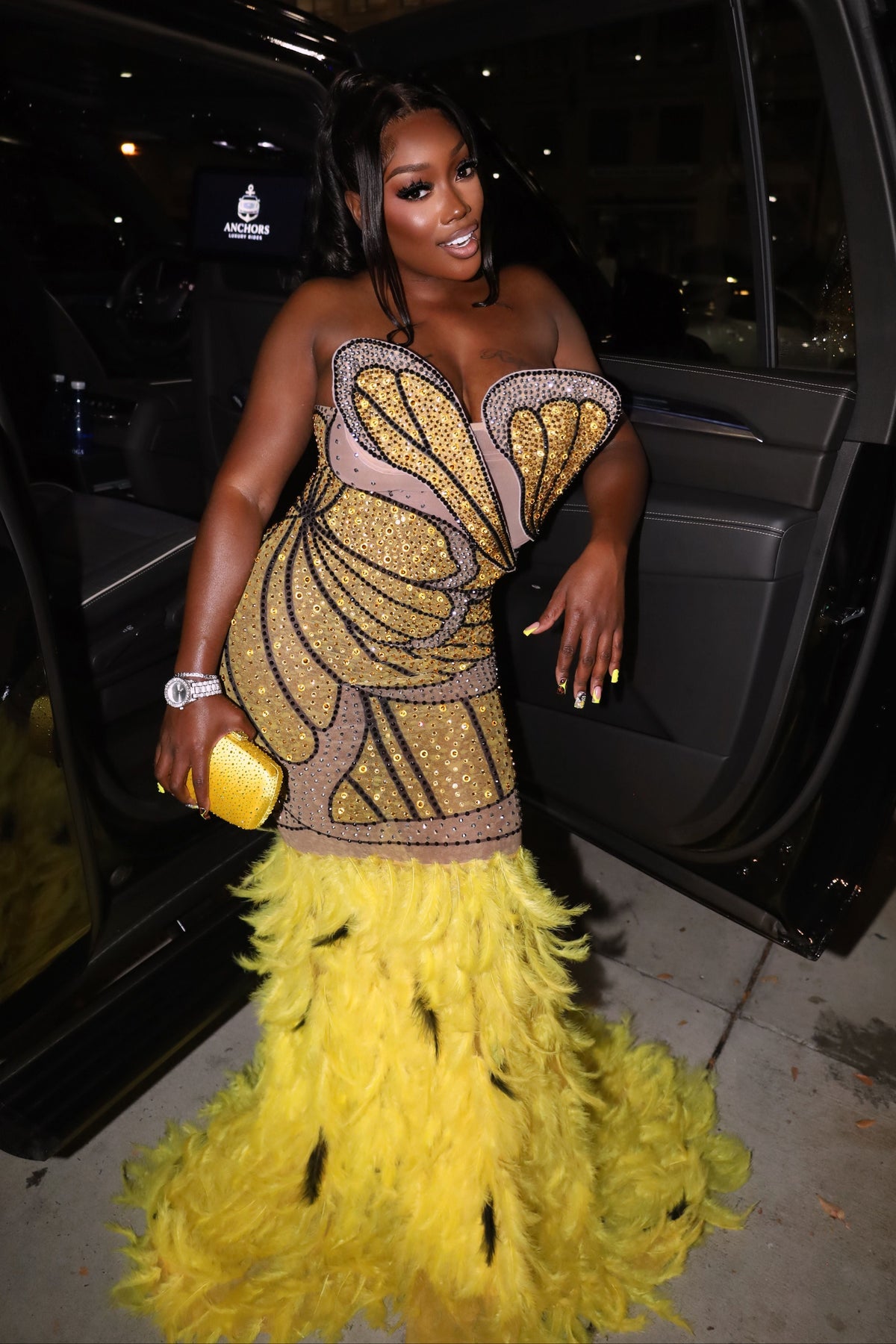 Make a dramatic entrance in the Petal Kiss Feather Gown, a couture masterpiece made to captivate. This strapless showstopper features a sculpted, sheer illusion bodice drenched in dazzling yellow and black crystals, with butterfly wing-inspired detailing contouring the silhouette. The design flows seamlessly into a lush, full-length feathered train, adding opulence and motion with every step.