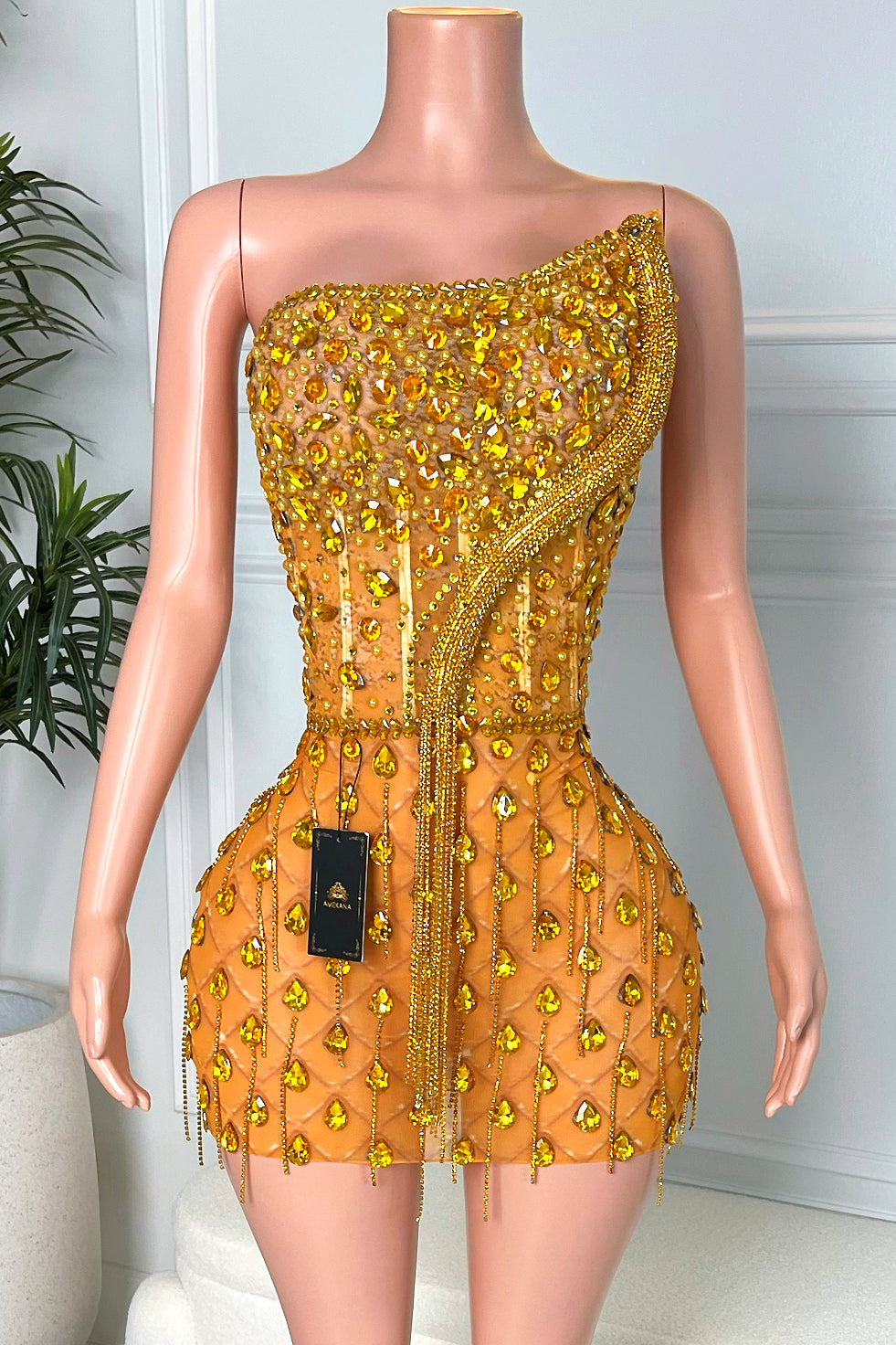 Covered in brilliant gold gemstones arranged densely at the bodice and in a lattice pattern on the skirt