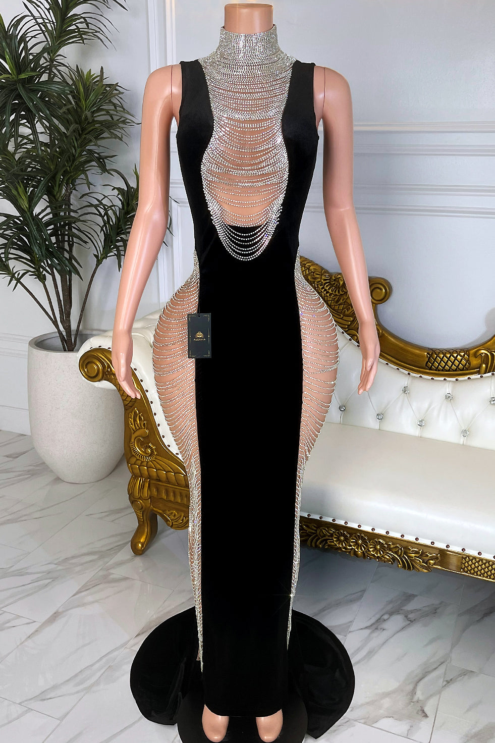 Dramatic cutout illusion at the front with cascading crystal drapes that frame the bust and waist