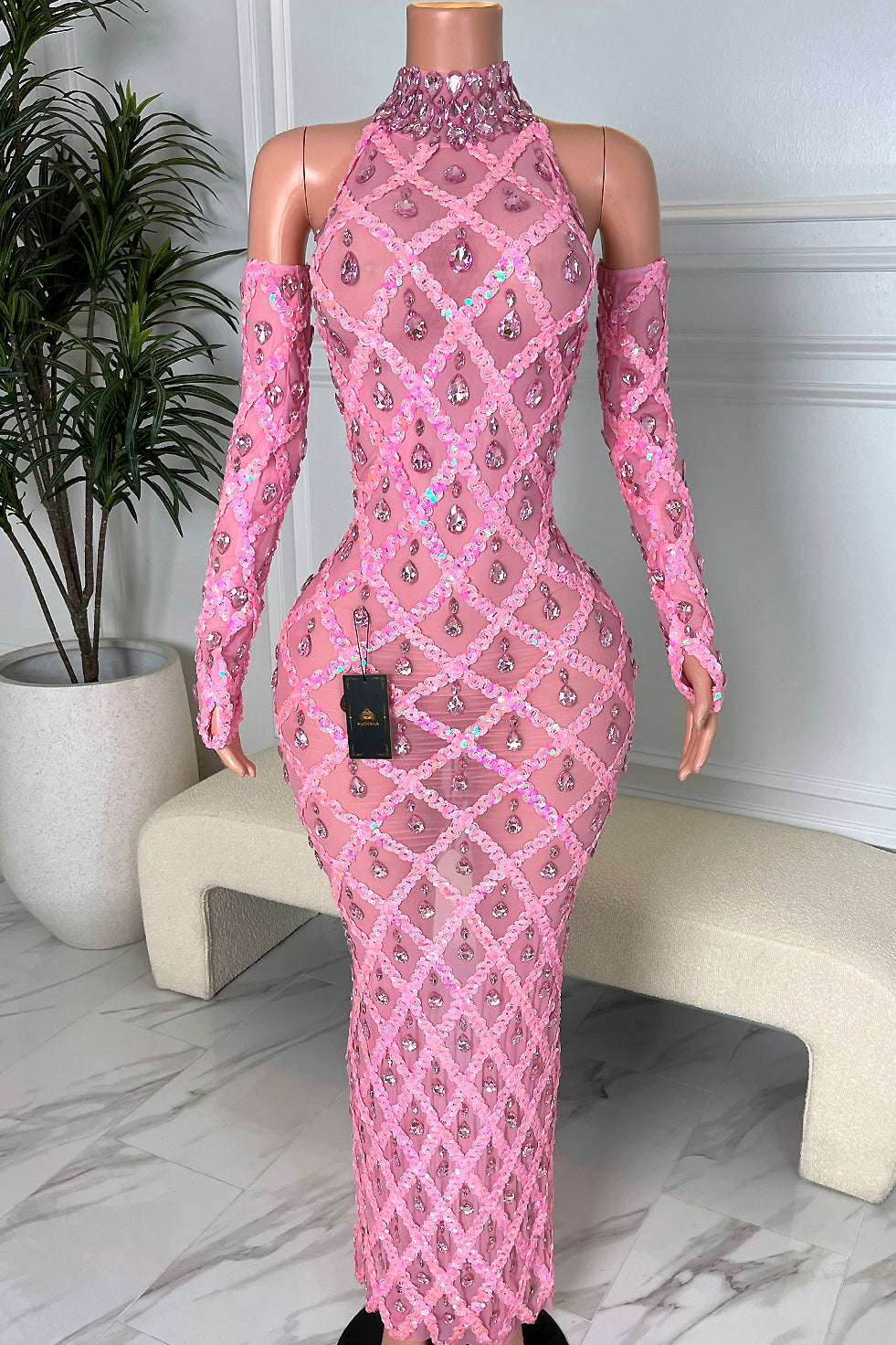 Mesh material creates an ideal foundation for the sculpture-like silhouette of this pink rhinestone dress. Suitable for a plethora of occasions including proms, cocktail parties, homecomings, housewarmings, and date nights, this sexy, classy, and elegant dress is a vibrant and exotic choice.