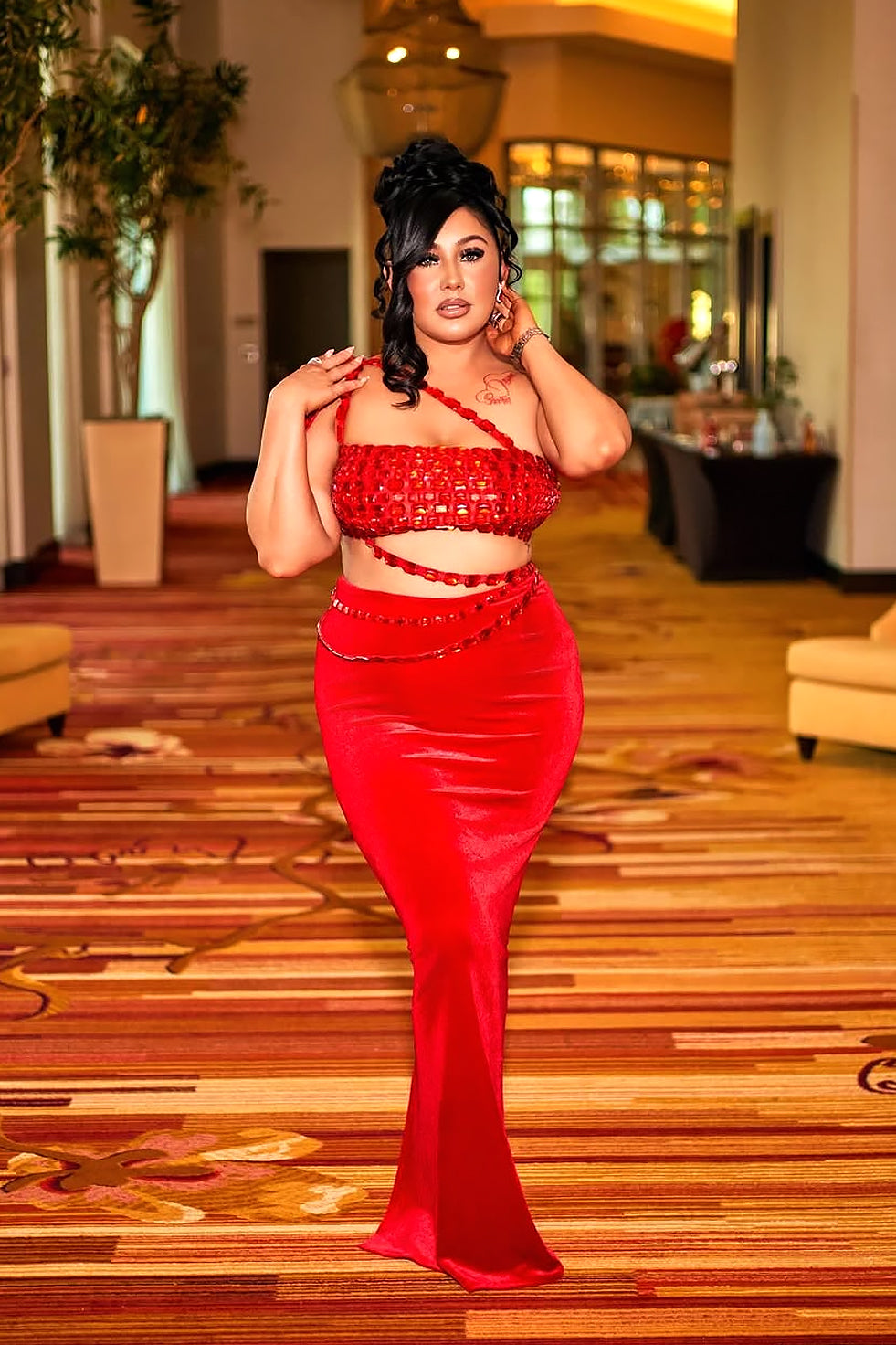 The Queen Set is made of high-quality and stretchy velvet, providing a flattering and comfortable fit for any occasion. Adorned with sparkling rhinestones, this exotic is perfect for prom, birthdays, clubbing, homecoming, date nights, and girls night out. Available in a stunning red color, make a bold and confident statement with this eye-catching set.
