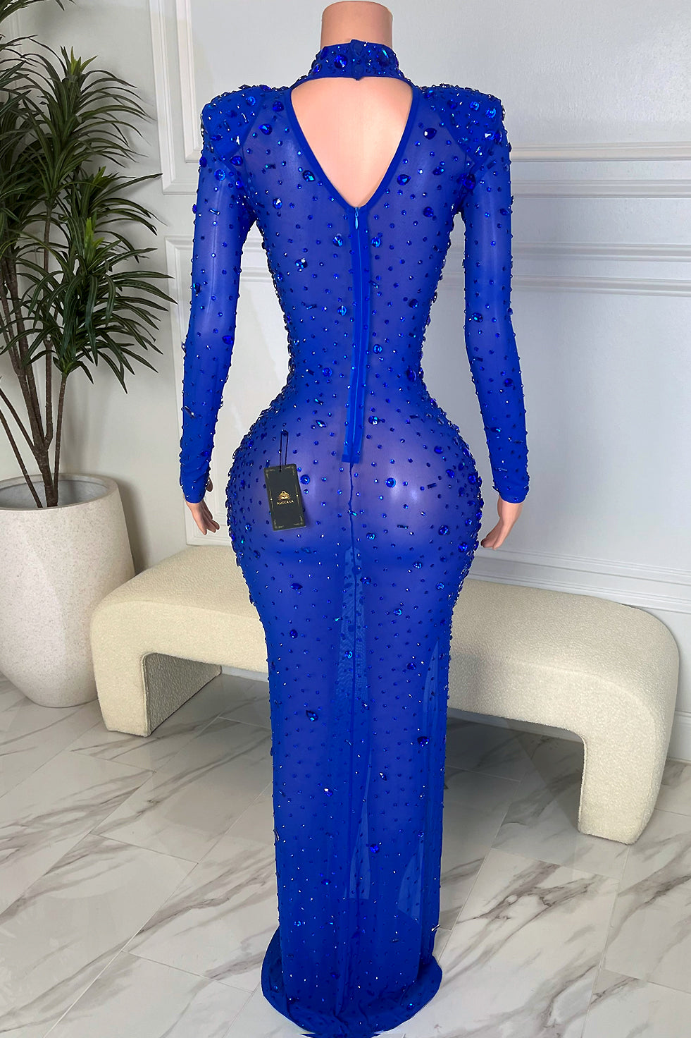 Elevate your style and turn heads in our Alaria Diamante Dress. Made with stretchy mesh and adorned with dazzling rhinestones, this maxi dress is perfect for any special occasion. With a slimming side slit and sexy long sleeves, you'll feel confident and glamorous all night long. Available in royal blue for the ultimate statement.