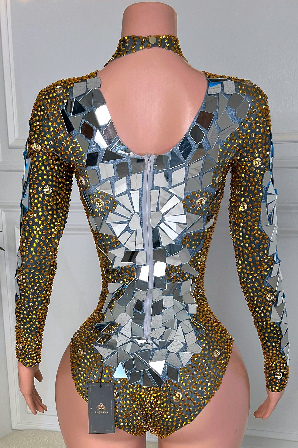 Sensuous and sexy, this alluring bodysuit is made from the finest Polyester and Spandex. With its vibrant gold rhinestones and classic silver mirrors, this piece is perfect for a night out clubbing with the girls, cocktail parties, or for a special concert. Unleash your inner diva and let your confidence shine!