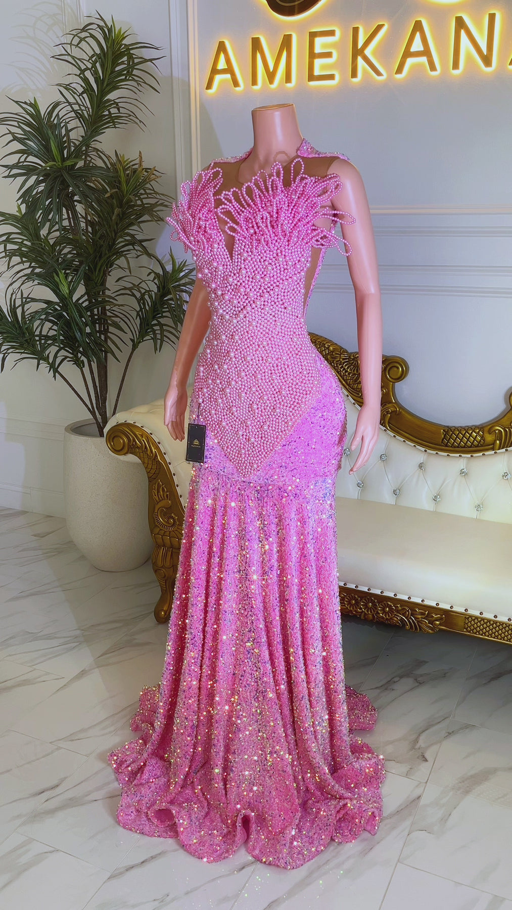 • Blush pink iridescent sequin mermaid gown that glitters under event lighting and flash